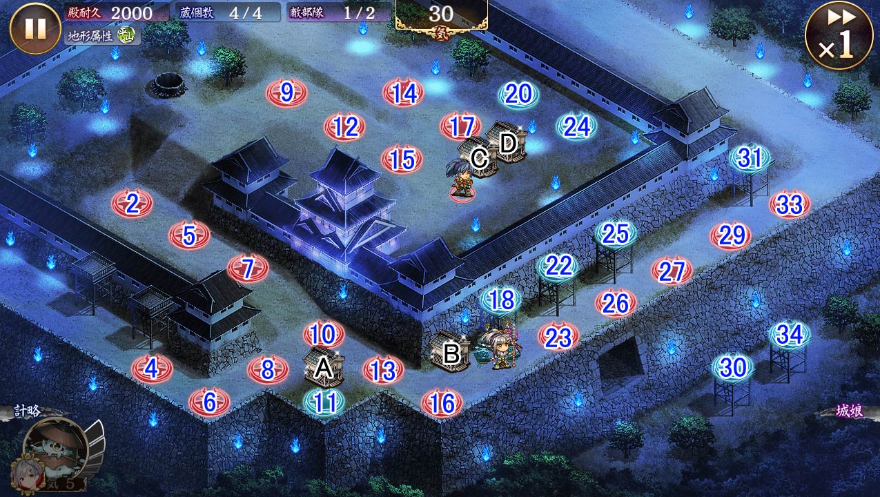 | 今回の合戦の難易度「普通」では、 『[肝試し]丸亀城』がお助け城娘として登場しています。 再配置や撤退を行うことはできませんが、巨大化と計略を駆使して勝利を目指しましょう。 |