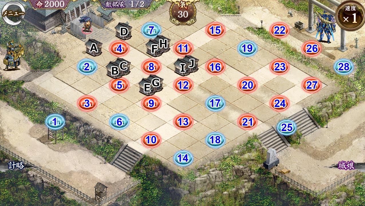 5,11,20,21に近接、13に盾、17に歌、19に大砲、6に遠距離。6は小十郎が出たら撤退して18に再配置で難全蔵。 --