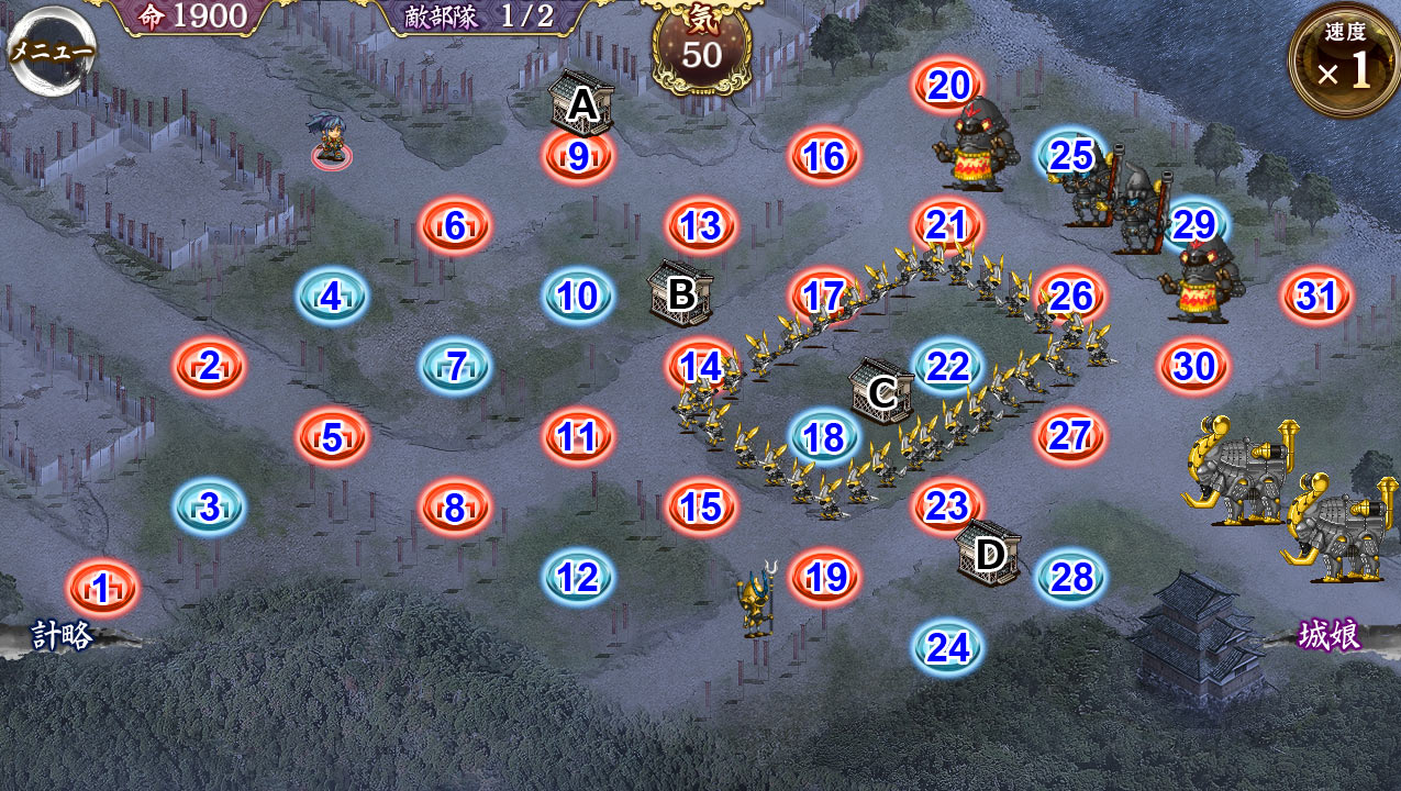 • 右(このページの図で象がいる道)から来る鉄砲が23よりもD蔵を先に撃ったはず。それ対策で27に近接を置いた記憶がある。 -- 2021-07-10 (土) 16:32:08