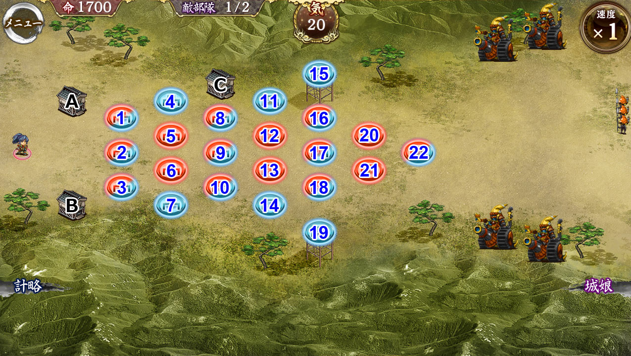 基本は、⑯⑰⑱に近接で壁を作り、⑪⑭⑮⑲に遠距離を置き、⑨に歌舞伎で最大化。これだけかな。単純に城娘のLVがものを言うマップだと思う。 --