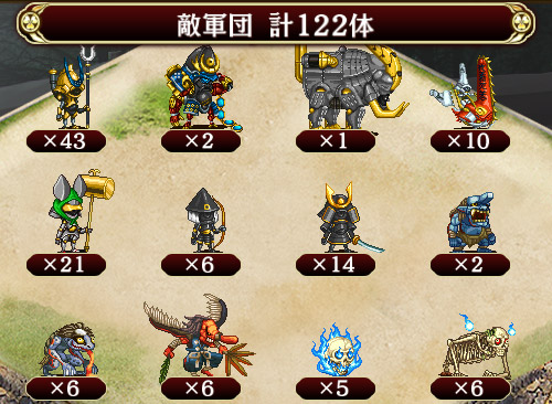 17高島、30島原、24山科本願寺、36ドナン、18尼崎、21鹿野、32コンウィ、28カナボンでなんとかいけました。高島&島原じゃないとチェーンマインが下に到達しちゃってキツイね。後、最後の骸骨はコンウィは1回、カナボンは全部の巨大化を残して、アイアンリングとドナンの特技回復を併用してギリギリでした。 --