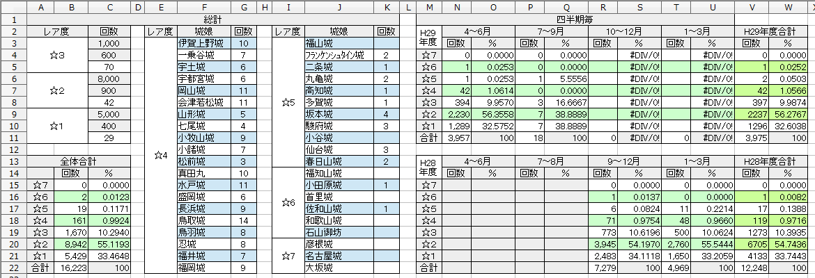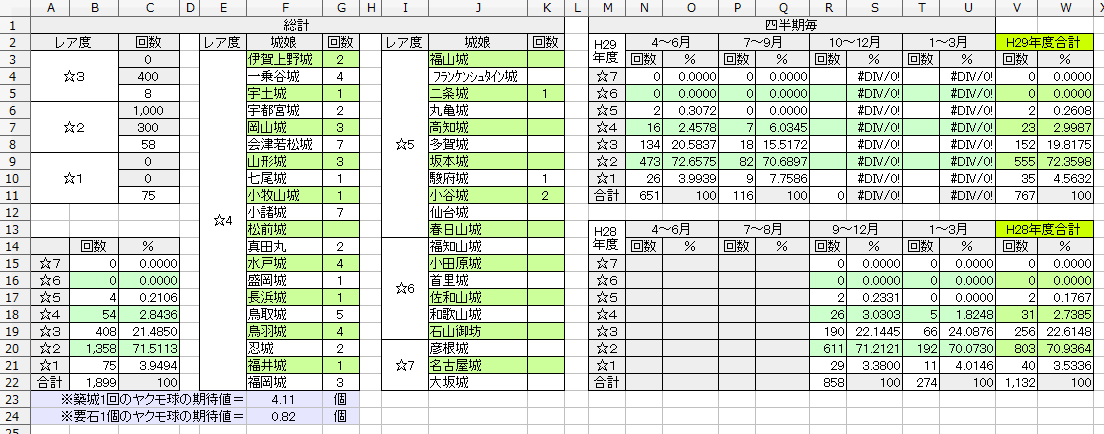 • 築城10からメモ取り始めて、最長のハマりで360回星4以上出てない時あった この付近の通常1000築城の星4以上の確率が0.5%、星3が9.8% 欲しい子が出ればいくらハマっても許せちゃうんだけどね -- 2017-03-20 (月) 13:38:55