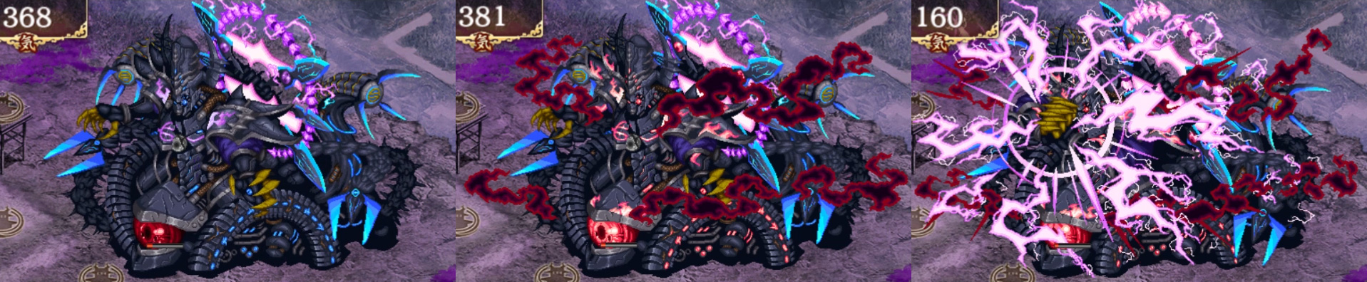 | 今回の合戦の特殊ルール 巨大した足利義昭は足利義昭の触手(青)を全て撃破するまで被ダメージを大幅に軽減します。 足利義昭の触手(青)は自身が撃破されるまで対応した大将兜を出現させ続けます。 |