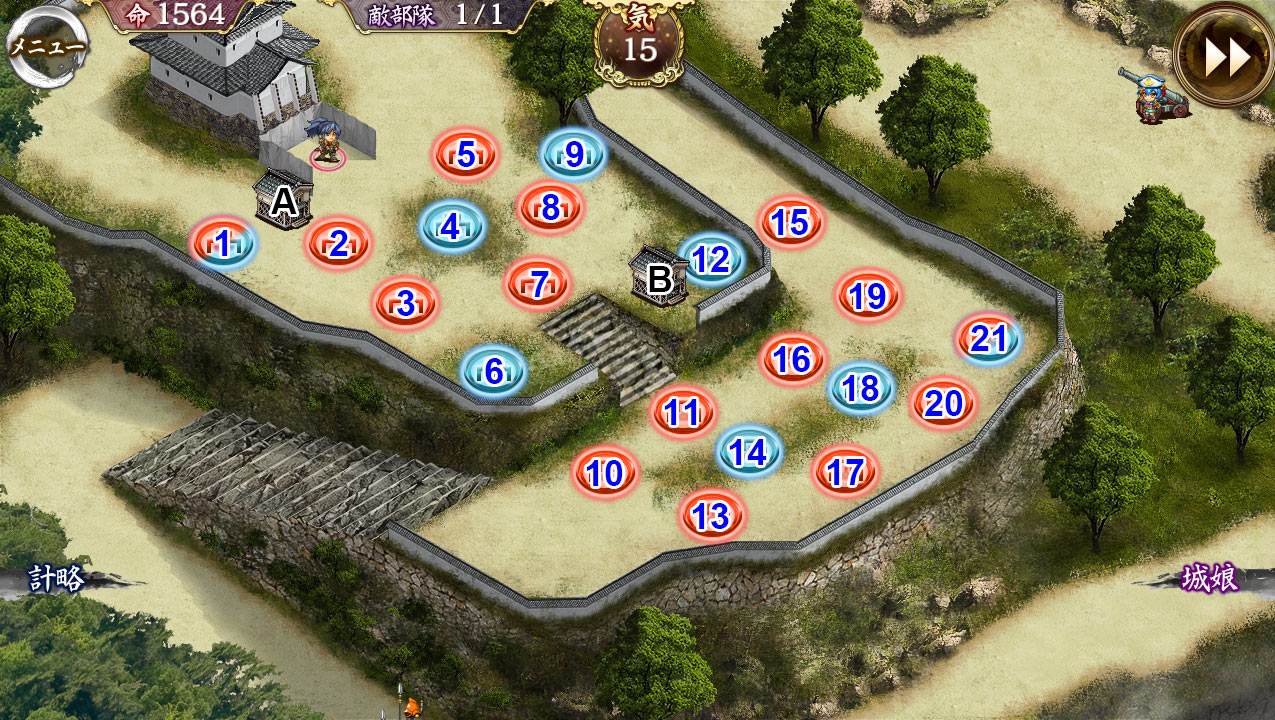 12、15、19、20、辺りは射程距離内であり、12に配置していると蔵Bも範囲攻撃で削られてしまう。