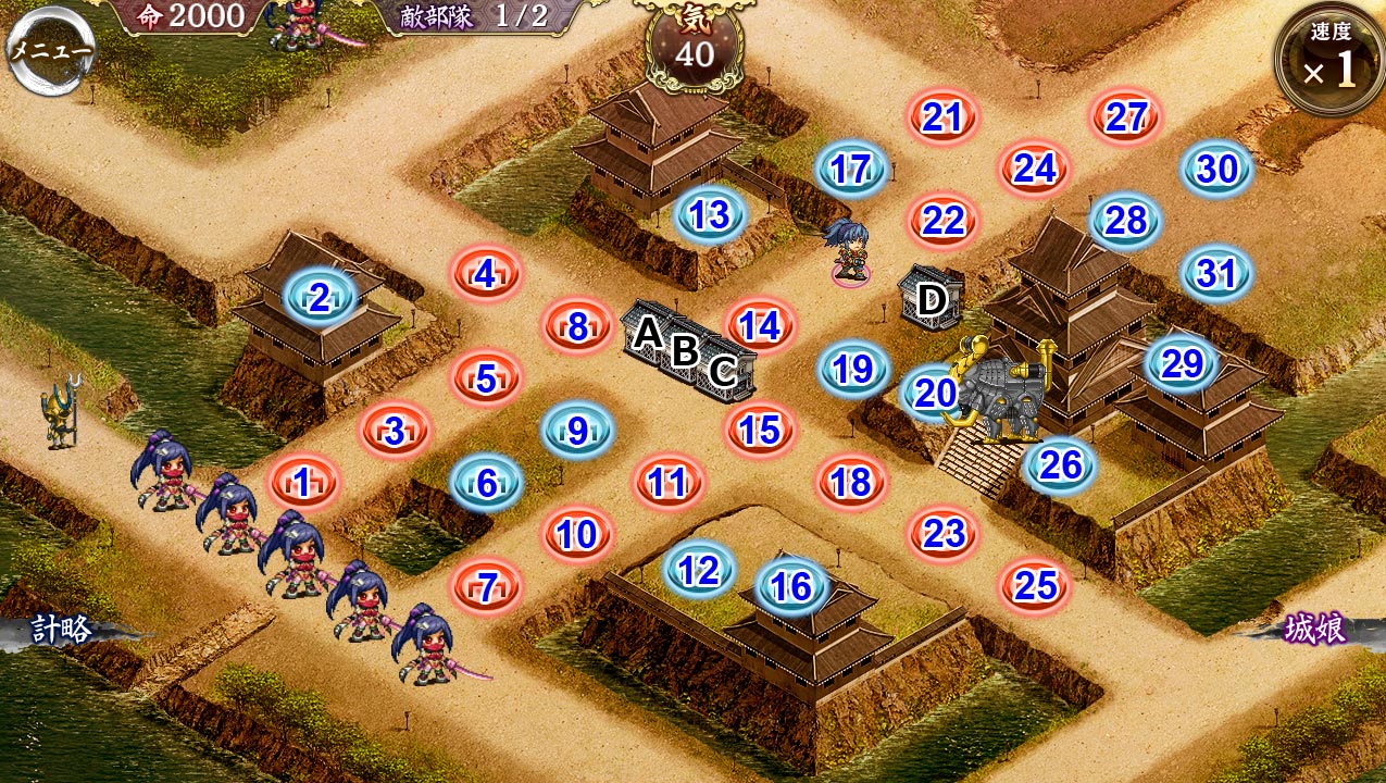 補足:敵側の刀城娘は通常2体同時攻撃だが、今回は1体攻撃の代わりに攻撃力が上昇している