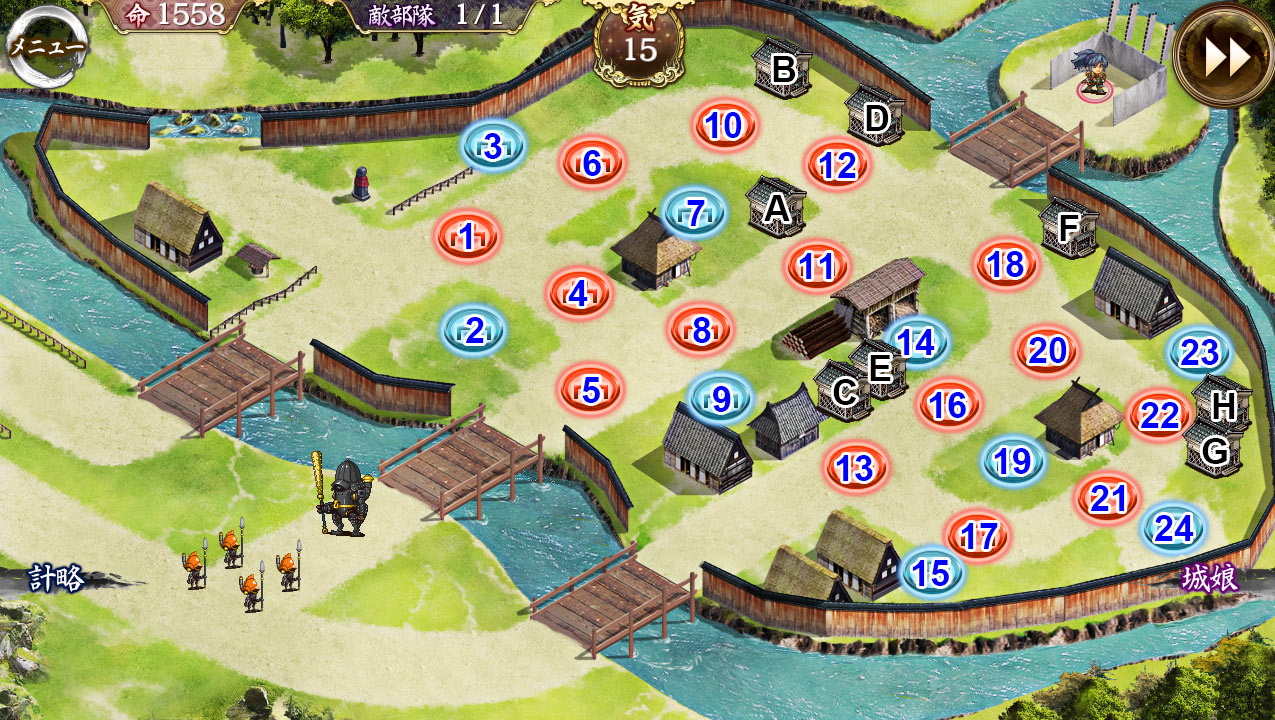 基本的に敵は上と中央の橋から来るので、戦力は画面中央寄りになります。下の橋は終盤にちょこっとだけ敵が来るので少しだけ気にとどめておこう。因みにwaveは1しかないので計略は控えよう。 --