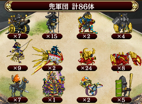 周回用編成。16臼杵改、5竜宮即最大化、16巨大化1、11ノビシャド、蛸を1部隊やり過ごしてから26島原改、16が大文字を倒してから21中津改、21を義元に届くまで巨大化、17ノビシャド、16最大化、21最大化。26が大破する場合、16最大化の前に、27に弩を置くと良い。 --