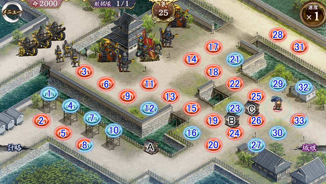 23:アクア(歌舞) 16:リーズ(弓) 29:岩山殿(法術) 22:夏名古屋(槌) 15:府内(刀) 30:柳川(石弓) 8:駿府(弓) 5:サンタンジェロ(盾) で、いちおう難クリア。 本当は府内の後に名古屋を置きたかったけど、敵の侵攻が早くて仕方なく名古屋を先に置いた。 サンタンジェロの配置も間に合わずに蔵が少しダメージを受けてしまった。 岩山殿の巨大化をある程度進めないと横道の敵に抜かれてしまう。 巨大化は岩山殿とリーズと駿府が優先。 離間でボスに敵の数を減らしてもらう。 ボスが来たらリーズとサンタンジェロのバリア、巨大化回復で耐え、夏名古屋まで来たら府内の計略で足止め。後は巨大化回復で耐えながら倒す。 --