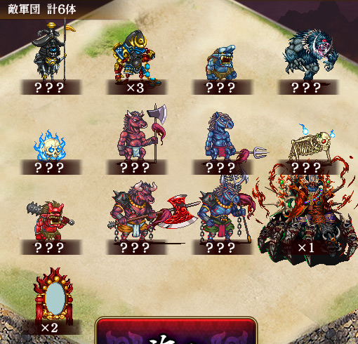 | <無間地獄効果> 無間地獄では『特定の敵』を倒すまで一部の敵が無限に登場します。 この合戦では『閻魔大王』と『浄瑠璃鏡』が特定の敵になります。 |