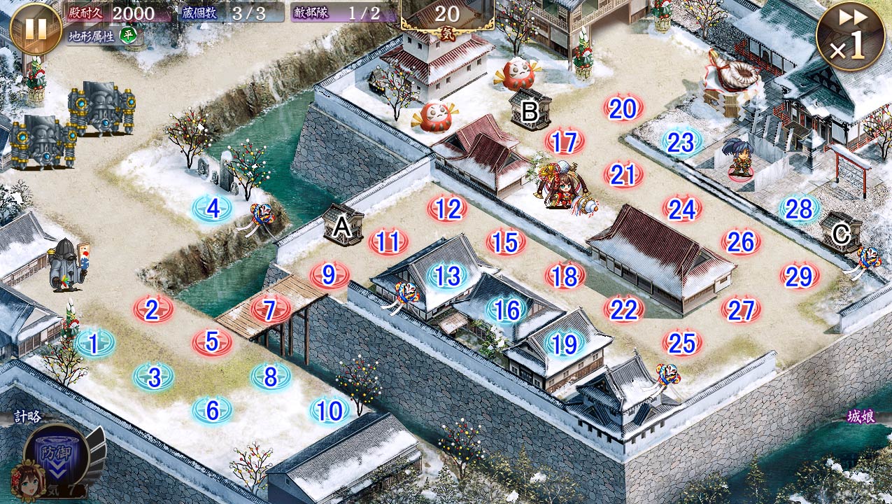 | 今回の合戦の難易度「普通」では、『[正月]錦城』がお助け城娘として登場しています。 再配置や撤退を行うことはできませんが、巨大化と計略を駆使して勝利を目指しましょう。 |