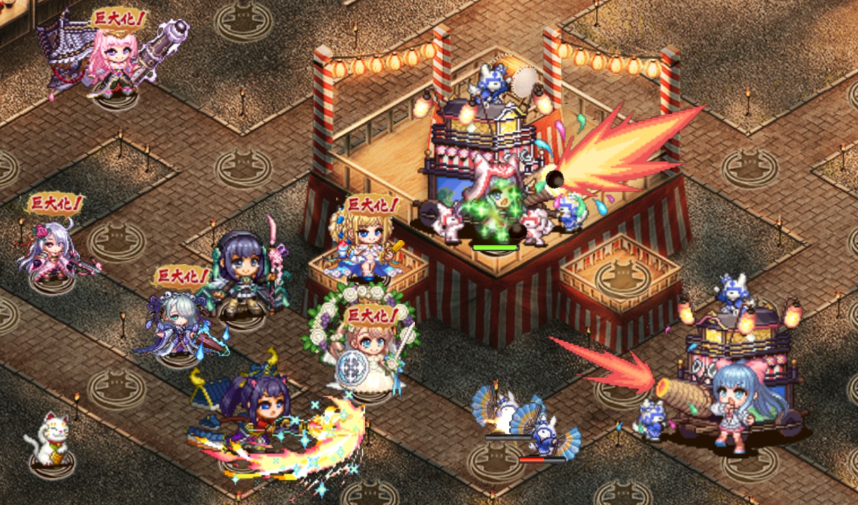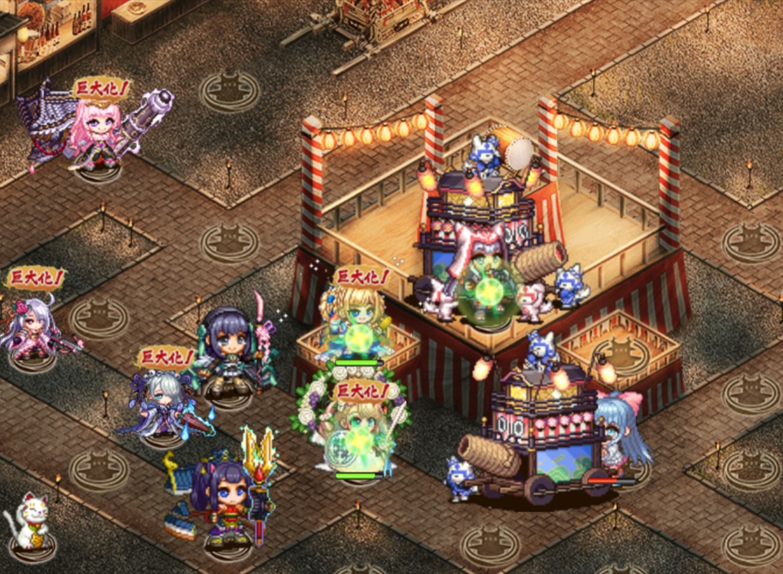 ほとんどの敵(城娘・獅子舞)は右側から下に回り込んで攻めてくる(左側から来るのは鉄砲2~3人くらい)。盆踊りしてる連中を遠距離で倒して、穴熊しても良し、右側に陣を張っても(左側に1~2人配置)良し。城娘と獅子舞の攻撃に注意するくらい。聚楽がマルチショットなことにも注意。 --