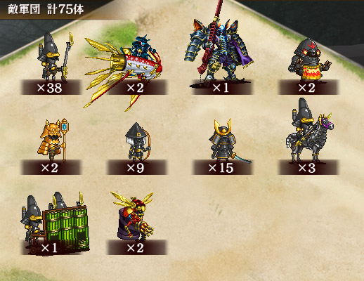 左下から来る鉄砲騎馬に殿を撃たれて戦功を逃しやすいので1体は左下に置いておくこと。ガトリング蜂対策も兼ねて投剣が良いか。また、ボスの射程が長く、下方面の蔵を撃たれてしまいがち。坂に槌あたりを置いて避雷針に。 --