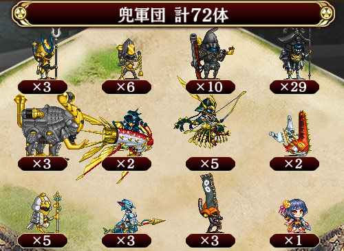 旗の処理はそれぞれ近接を置いて迅速に処理。その後は佐竹式毛虫形兜に向けて弓を12か15で育てる、ただし敵の攻撃に幾らか晒されるので回復行動か壁を準備して置く。
