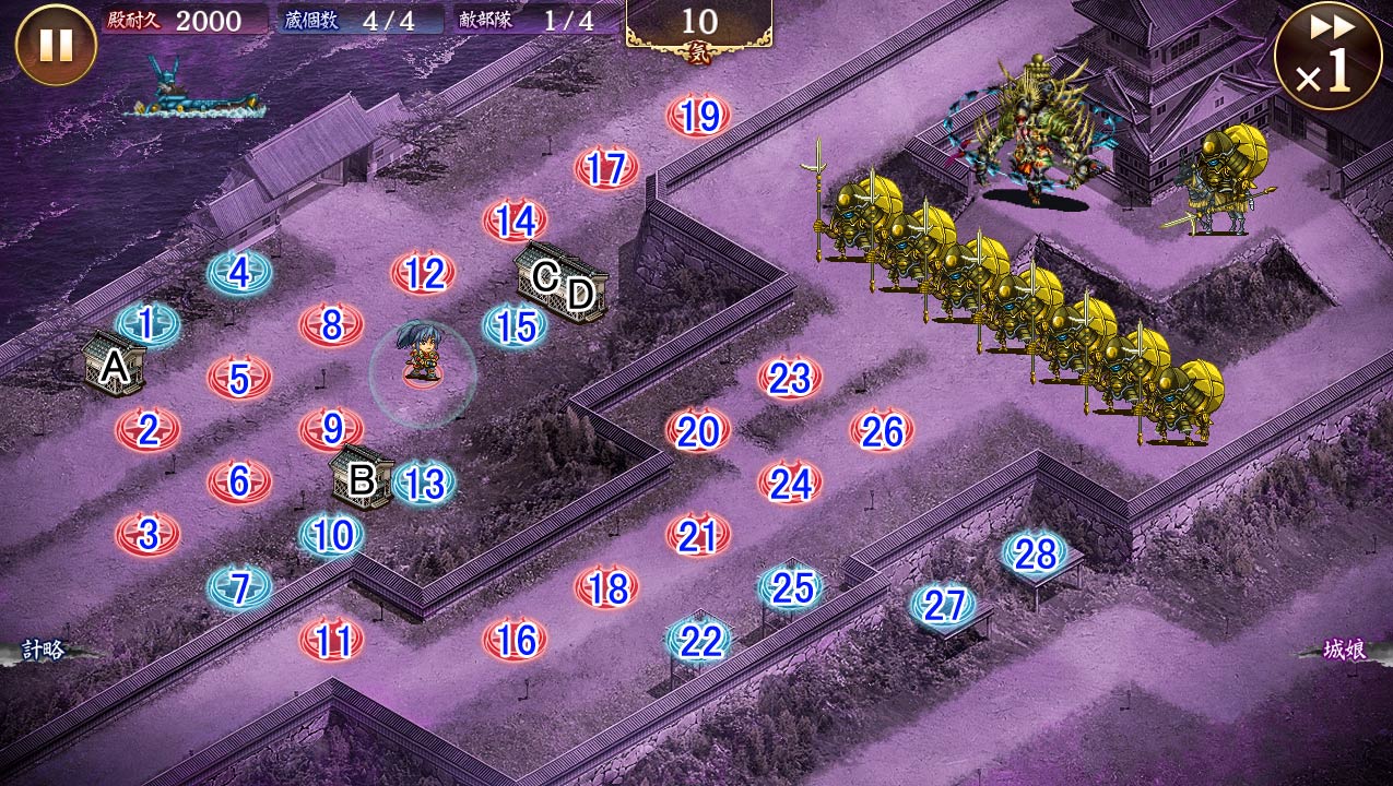 | 今回の合戦では、豊臣秀吉の特殊特技『刀狩り』で以下の効果が発動しています。 一部を除いた初期武器種の城娘の射程を半減、射程の強化効果を無効。 対象武器種:  |