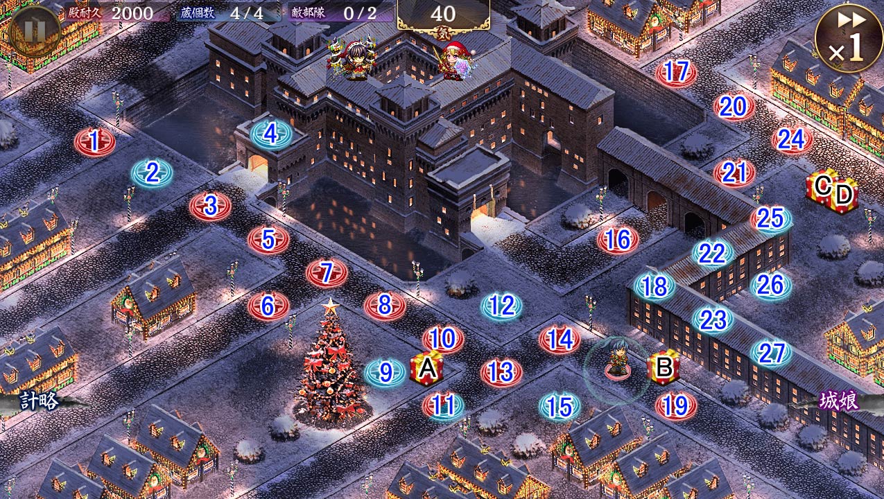 | 今回登場の敵城娘とパパ・ノエル人形はそれぞれ以下の特技を発動しています。 [聖夜]サンタンジェロ城:自身の被ダメージを25%軽減、味方の耐久を15%上昇。 [聖夜]城塞都市トレド:自身の攻撃を50、攻撃速度を20%上昇。 パパ・ノエル人形:自身の範囲内の[聖夜]城塞都市トレドへのダメージを代わりに受ける。 |