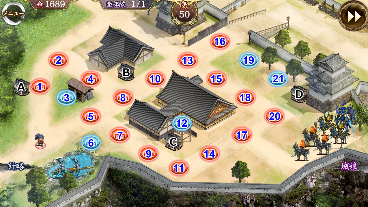 19:アクア(歌舞) 21:アンボワーズ(鈴) 11:春日山(刀) 13:郡上八幡(槌) 12:岡豊(弓) 6:ゆんゆん(杖) 18:小谷(槍)(あとで10) 1:さやか(刀) で、難クリア。 さやかの配置は左上からハンマーが出現してからでいい。 アンボワーズを優先的に最大化。次に岡豊。岡豊の最大化が終わったら小谷を10に再配置。 小谷を最大化させつつ、アンボワーズには岡豊の計略をかけ続けて攻撃力を底上げ。 正宗が動いてアクアの範囲に入ったらアクアの計略で威力を底上げ。政宗を倒せばあとは楽。 --
