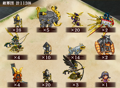 | 今回登場の高鍋城と都於郡城は、 全ての兜と敵城娘を対象に以下の特技を付与しています。 攻撃速度が16%、攻撃が100、射程が25、耐久が600、回復が6上昇。 ※高鍋城と都於郡城は合戦に参加せず、攻撃や回復行動をおこないません。 また、その他の敵が全て撃破されると、合戦勝利になります。 |