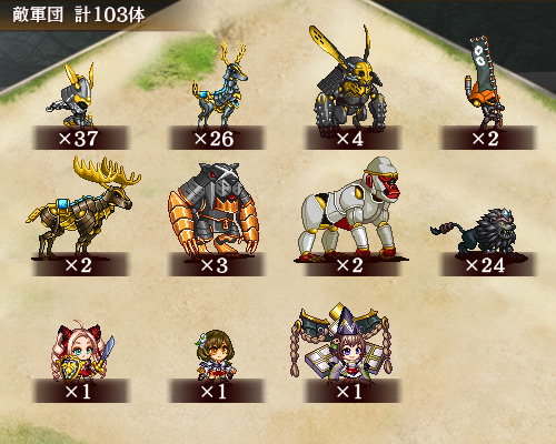 | 旗印兜が戦場にいると敵側の士気が高揚し、全ての敵の耐久と攻撃が50%上昇します。 複数いた場合、効果は重複しません。 |