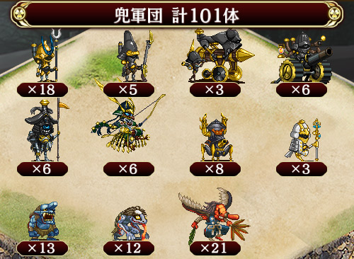 歌舞が非常に生き、また飛行型も多いので弓も重要となる。歌舞以外は山で揃えれば平均50もあれば難でも特別戦功達成も困難ではない。近接は7(全蔵守るには13も)には必要だが、それ以外は被弾して巨大化に必要な気を考えると、その分遠距離を巨大化させた方が楽に攻略できるようになる可能性が高いということも重要。