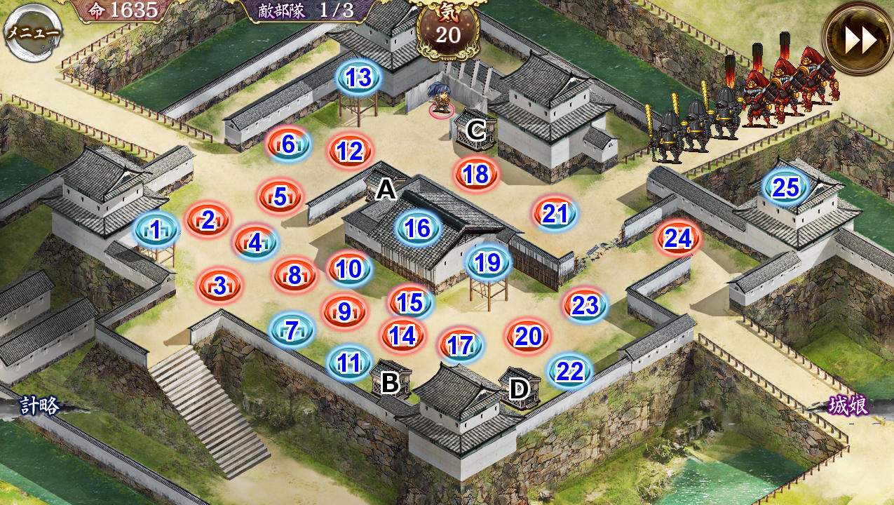 多聞山改50、鹿野改61、岡山改61、小牧山改50、伊賀上野改50、多賀改61、乙女50、福岡改50 LV若干高いので武器は☆3無印調整、計略気トークンのみで、全蔵守り大破無しいけました。配置は上コメの難蔵無傷と同じで屋根上小牧(範囲速度up特技)です。多賀城最大化優先。2Wの階段下鉄砲で乙女撤退再配置。3W右下からの鉄砲隊に注意して適宜巨大化でいけると思う。 --
