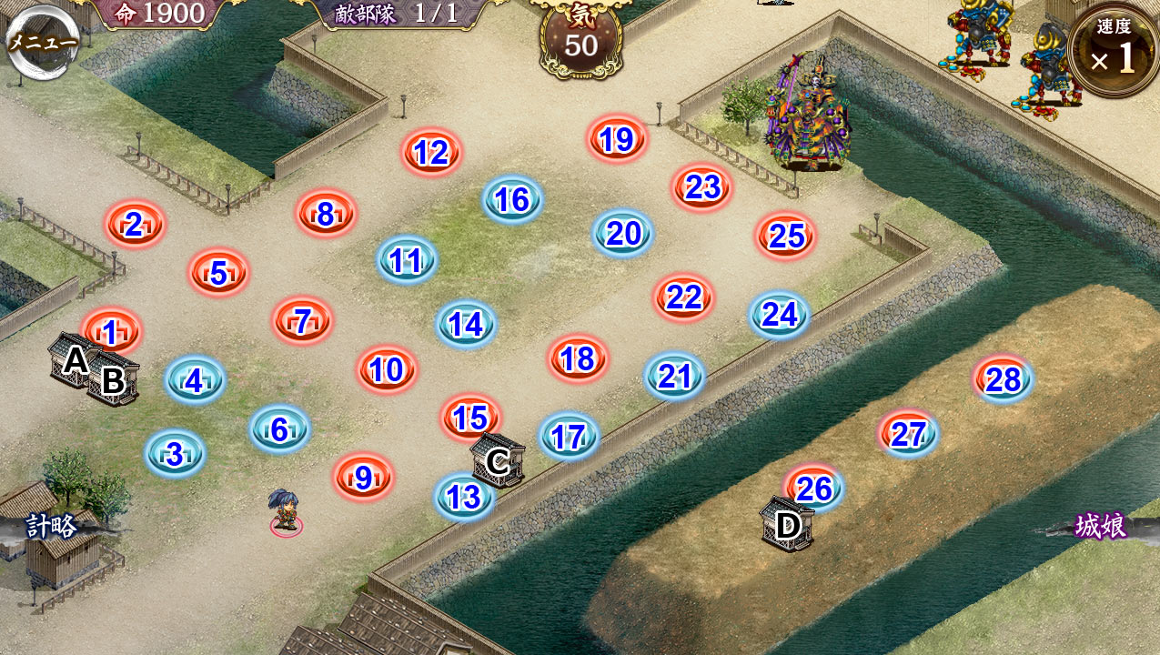 周回用編成。16臼杵改、5竜宮即最大化、16巨大化1、11ノビシャド、蛸を1部隊やり過ごしてから26島原改、16が大文字を倒してから21中津改、21を義元に届くまで巨大化、17ノビシャド、16最大化、21最大化。26が大破する場合、16最大化の前に、27に弩を置くと良い。 --