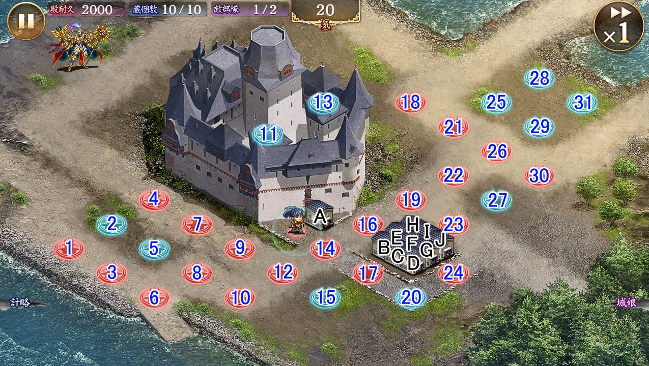 初めほぼ同じ編成でやってみてから再編しました。上のルートも下のルートも弓が大挙して押し寄せるので、高耐久紙防御の拳は相性が悪かったです。鬼ヶ城1、高島城2、カーナーヴォン城4、伊勢長島城5、明石城11、尼崎城24、菖蒲城26、平戸城27。高島と長島は周りの近接より先に配置するのをお忘れ無く。尼崎の計略を使えば、高島の巨大化2回ほどでリチャードの下にいる魔法使いまでは始末できました。平戸城の海賊トークンは、弓にもリチャードにもデコイとして活躍してくれました(レベル71でリチャードの攻撃2発分のデコイ)。上ルートからの攻撃が終わったら、役目を終えた菖蒲を7に移動させれば、高島と長島がリチャードのターゲットから外れるのでやりやすくなります。あとは温存してた巨大化使いつつ餅つきでした。長文失礼でした。 --