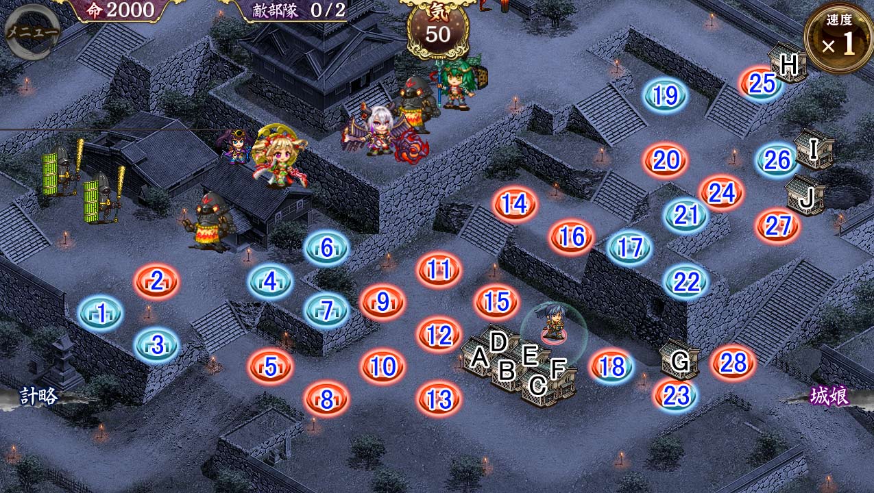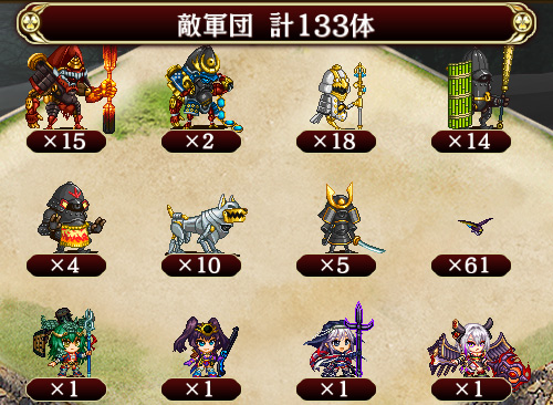 | 今回登場の敵の城娘は、それぞれ自身の特技を発動しています。 松坂城は自身の耐久を17%上昇させています。 北ノ庄城は自身の攻撃範囲内の敵の攻撃を15%低下させます。 坂本城は範囲内の敵城娘のみを対象に、防御を20%上昇させます。 安土城は自身の攻撃範囲内の敵の被ダメージを20%上昇、防御を25%低下させます。 また、自身の攻撃を35%上昇、攻撃が対象の周囲にもダメージを与えます。 近江八幡城は敵城娘を対象に、耐久を500、攻撃範囲を20上昇し、回復30(耐久が毎秒30ずつ回復)の効果を付与します。 また、近江八幡城は回復行動を行わず、攻撃対象になりません。 近江八幡城を除く全ての敵が倒された場合、合戦勝利となります。 |