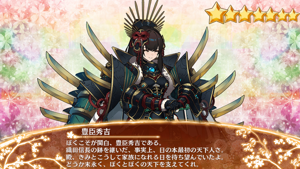 城プロでは、始めは「羽柴」として信長の周囲で動いていたが、信長の死後「豊臣」と名乗り、本格的に活動を開始する。城娘の前に突然現れ、警告だけして去っていったり、信長の援護に来た勝家を足止めしたりと、その本意を全く図れない動きを見せるも、どこか自分達や城娘の運命に対し諦めにも似た感情を抱いている。