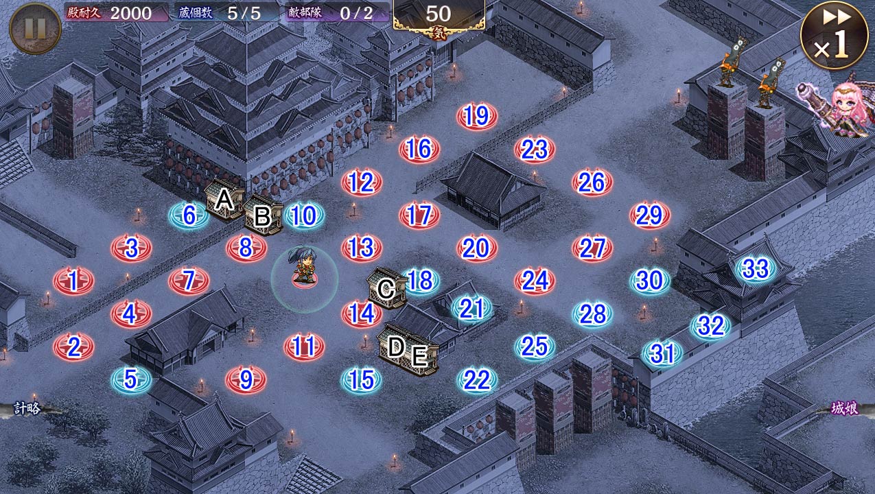 緊急出兵:選ばれし城娘と秘伝武具 伍の陣 | E-1 | E-2 | E-3 | 絶壱 | E-4 | E-5 | 絶弐 |