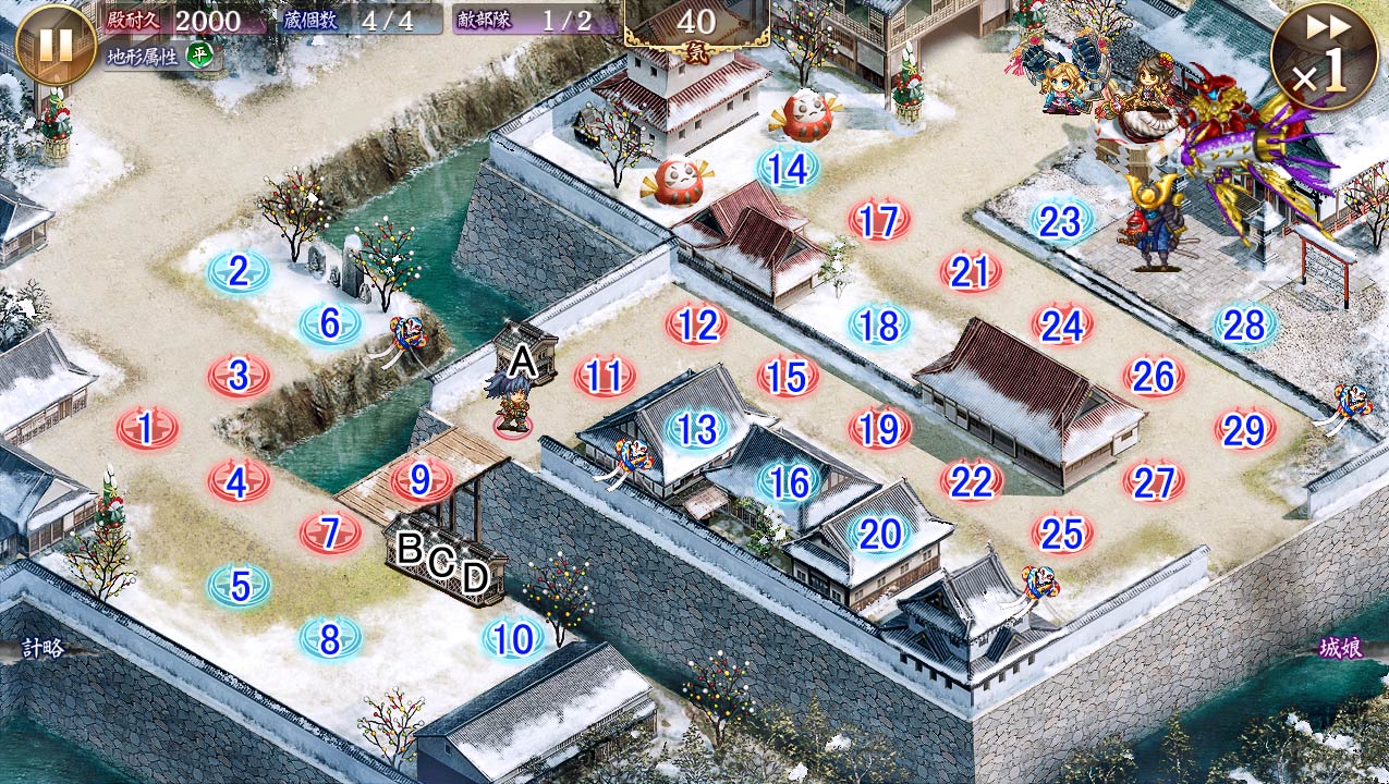 | 今回登場の[正月]敵城娘はそれぞれ以下の特技効果を発動しています。 『[正月]大宝寺城』: 自身の攻撃が20%上昇。射程内の敵軍ユニットの攻撃が70上昇。 『[正月]七飯台場』: 自身の攻撃が30%上昇。射程内の殿側ユニットの防御が25%低下。 |