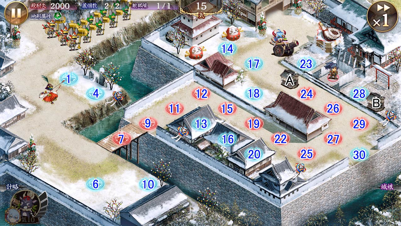 | 今回の合戦の難易度「普通」では、『[正月]宇和島城』がお助け城娘として登場しています。 再配置や撤退を行うことはできませんが、巨大化と計略を駆使して勝利を目指しましょう。  |