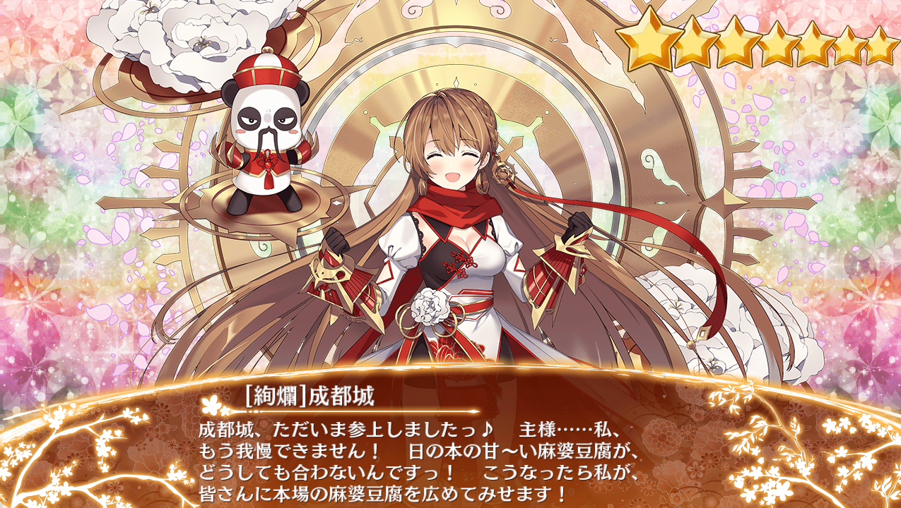 | 1 | [絢爛]成都城の伏兵配置時の 耐久/攻撃の1.4倍 | 434 | 320 | 10 | 四川の爪撃 敵2体を足止めし、4連続攻撃を行う。自身と [絢爛]成都城の攻撃と防御250、与えるダメージ 70%上昇、被ダメージ50%軽減、全マス移動可能 | |