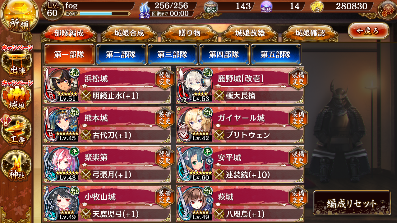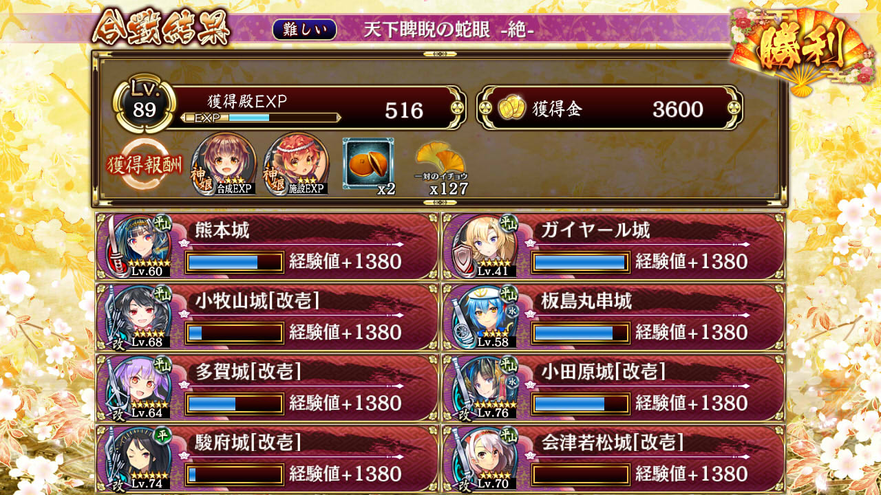 3 前田金沢(64) 4 安平古塁(65) 5 福知山(75) 7 小牧山(70) 12 熊本(64) 15 鹿野改壱(68) 17 伊予松山(83) 19 萩(58) 熊本と萩が育つと、眼鏡完封できるね。赤法術は回転砲で橋を渡らせずに瞬殺。今回は、こちらを見ずに試行錯誤していたので、2に前金を置いていたら、左上から川を渡ってくる水色(槍?)にAをしつこく破壊されて参りかけた。試しに3に前金を置いたら、けっこう余裕があった。絶難自体は一発でクリアしたけれど、全蔵のために3個は珠を割ったかなあ。 ここの情報を見ようか迷ったけれど、最近、自力で編成・配置を考えるのが弱くなったなあと思って、我慢。ここの情報の質のよさがあらためてわかった気がする。でも、自力で編成と配置、デバフ、トークンを考えていたら、楽しかった。 -- 2017-01-07 (土) 23:28:28