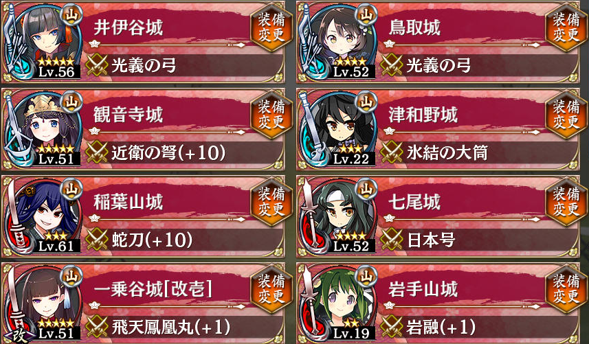 9鹿野改(平山槍69)、14井伊谷(山弓53)、12小牧山(平山弓53)、7鳥取(山弓56)、13一乗谷(山刀53)、6与板(山刀56)、5和歌山(平山刀63)、8岐阜(山銃56)、4神社 12の弓を早めに最大化すると楽です。5、6が突破されるようなら与板の計略でゴリ押しを。殿が攻撃を食らうようなら9の鹿野を15に置くのがよろしいかと。 --