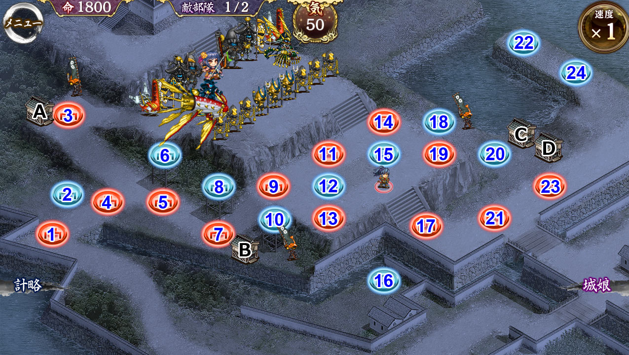 難所は、1ウェーブ目の黒旗が居る中での兜ラッシュ、中盤以降全体を飛行する佐竹式毛虫形兜の処理。2ウェーブは右側の象と人魚の処理、それに伴うC,Dの蔵防衛、そして最後の佐竹式毛虫形兜。