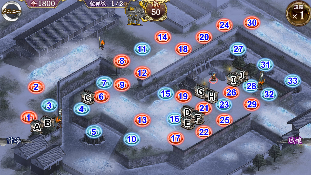 忍城は右のルートを通る。27は攻撃されるため注意。31と33も攻撃されるが氷上ですぐ通り過ぎるのであまり気にする必要はない。