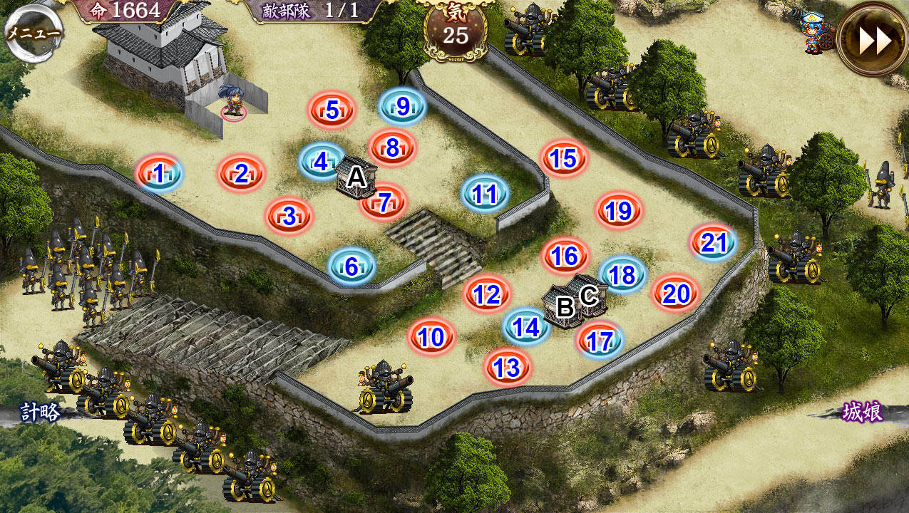 敵城娘・板島丸串城はMAP右上で待機し続けた後、大きくグルリと下側を回って左側から侵攻してくる。