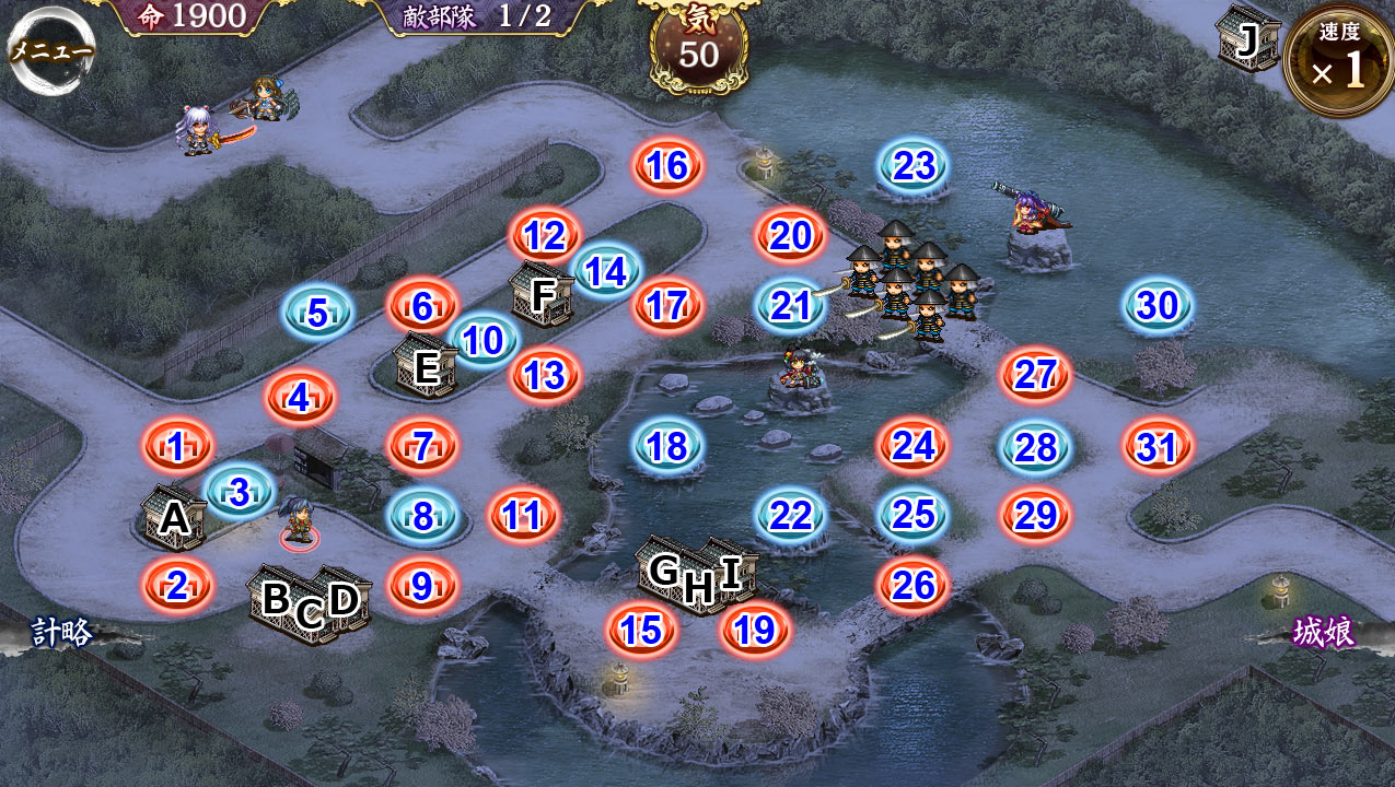 このマップの要点は以下の通り。やはり城娘の配置順によるターゲット操作が重要となる。