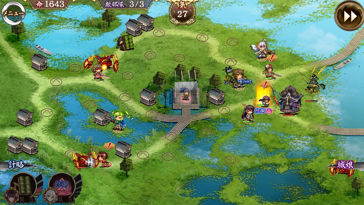 • 上の木で出ていたので本当にレア3だけ(改壱、ウサギ、札、足止めなし)平均30(Lv20台後半多め)ぴったりでやってみたよ。装備はこんな感じ(うまくいけば下位武器でも代用は出来そう)。全蔵防衛とまではいかなくても計略(特にダメージ系や伏兵系はうまい!)や撤退・再配置をうまく使えばとりあえずクリアはいけるね。一部Lvが高いのがいるのとあと雑賀が落ちてる(気づくのが遅く撤退失敗)のは許してクレメンス -- 2016-08-19 (金) 21:41:50
