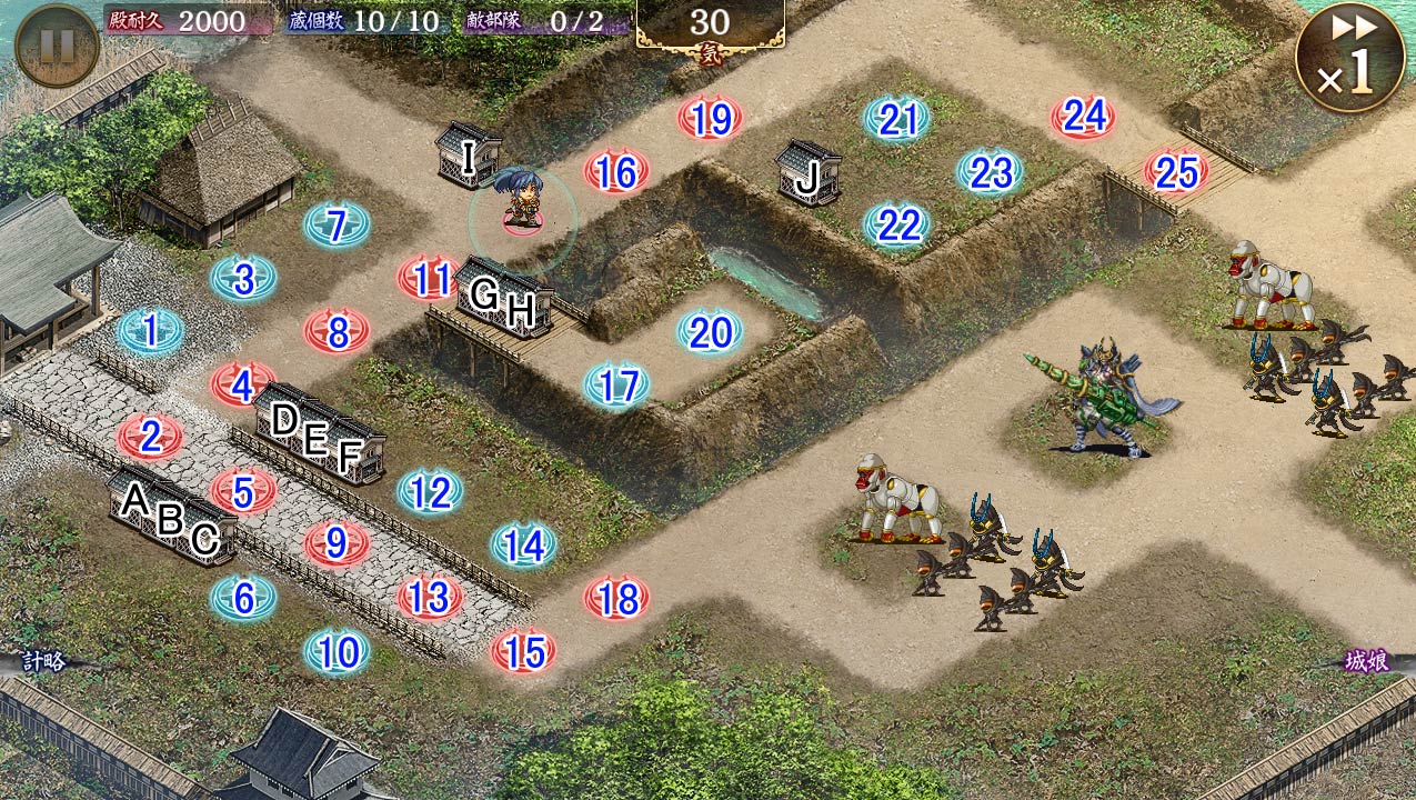 追記。17弓、15槍、18盾と置くと、盾で止めた敵を集中放火できて良いと思う。巨大化を後回しにしてたら忍者を討ち漏らしてダメ計で焼いたけど、氏康を削る必要が無いんだったら、とっとと槍を最大化しておけば良かった。 --