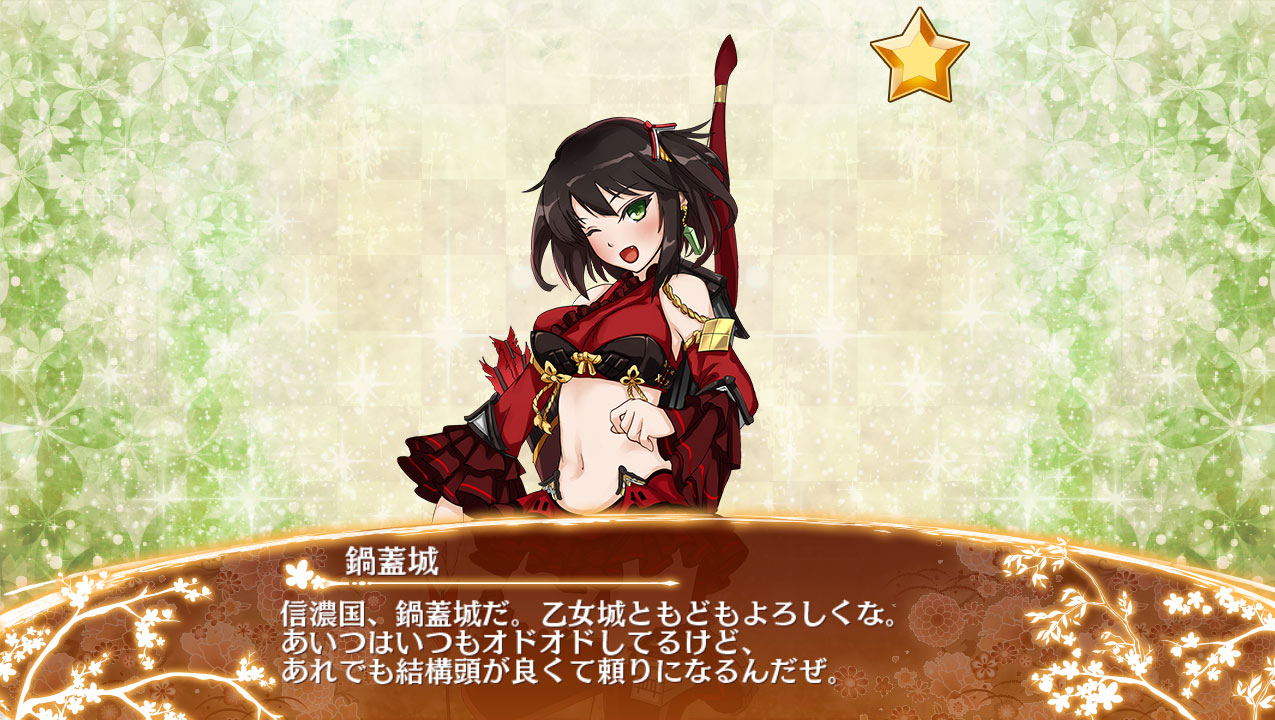旧作では乙女城と2人で1つのユニット扱いだったが今作では別々のユニットになった。御嬢モードの彼女の左手にその当時の名残が見える。