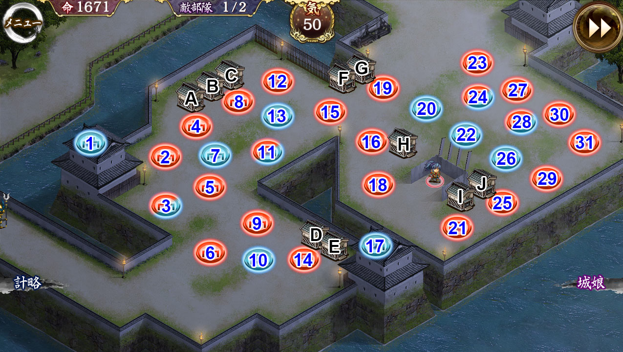 今回も困ったときのカナボンでなんとかなった。25で蔵守っといて、中津・丸山が登場したところで3の遠距離にアイアンリングかけて撤退。3がアイアンリングで耐えてる間に丸山を倒して、アイアンリングが切れたら3は撤退。あとは撤退しといたカナボンを再配置して終わり。 --