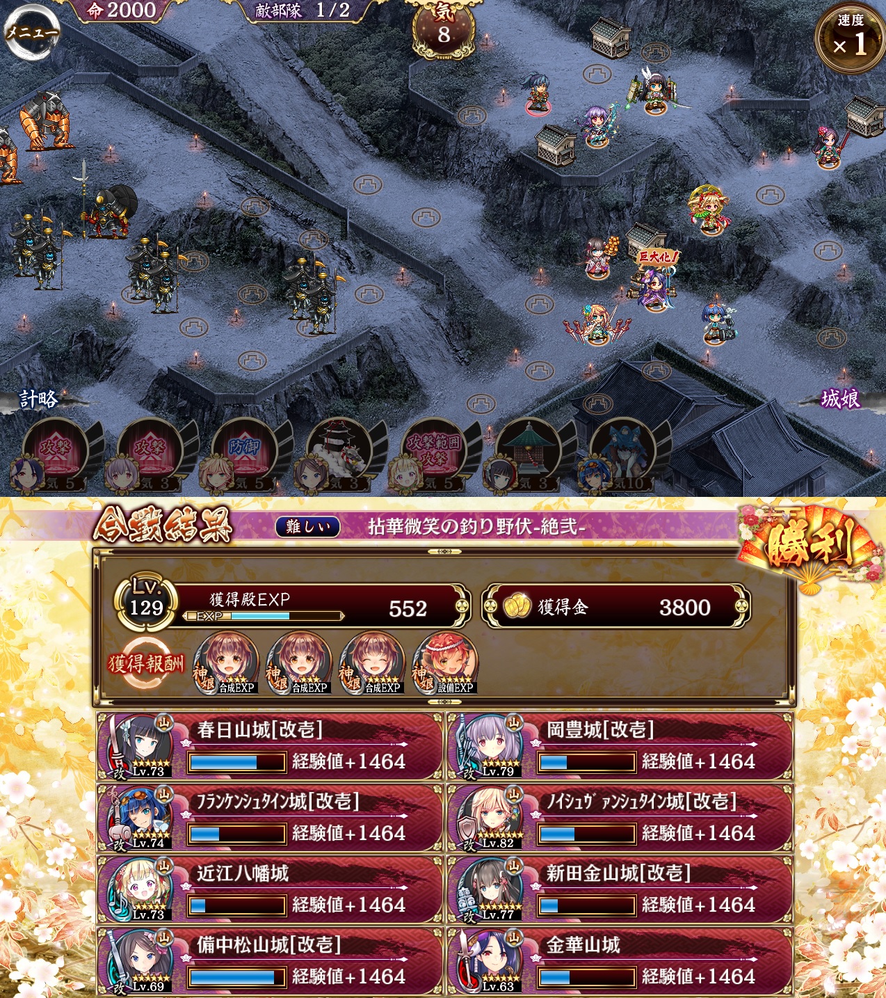 結局高レアの暴力に頼って難戦功ゲット。16鹿野→18大坂→20シェーンブルン→24新田金山改→25岩殿山→23佐和山改→15紫禁→22ノイシュ。佐和山を最大化させて右側の攻撃を任せて、あとは親分熊に負けないように紫禁と大坂、シェーンブルン辺りを適宜巨大化でしのげました。 --
