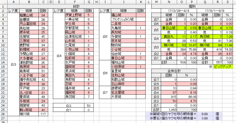 • 築城10からメモ取り始めて、最長のハマりで360回星4以上出てない時あった この付近の通常1000築城の星4以上の確率が0.5%、星3が9.8% 欲しい子が出ればいくらハマっても許せちゃうんだけどね -- 2017-03-20 (月) 13:38:55