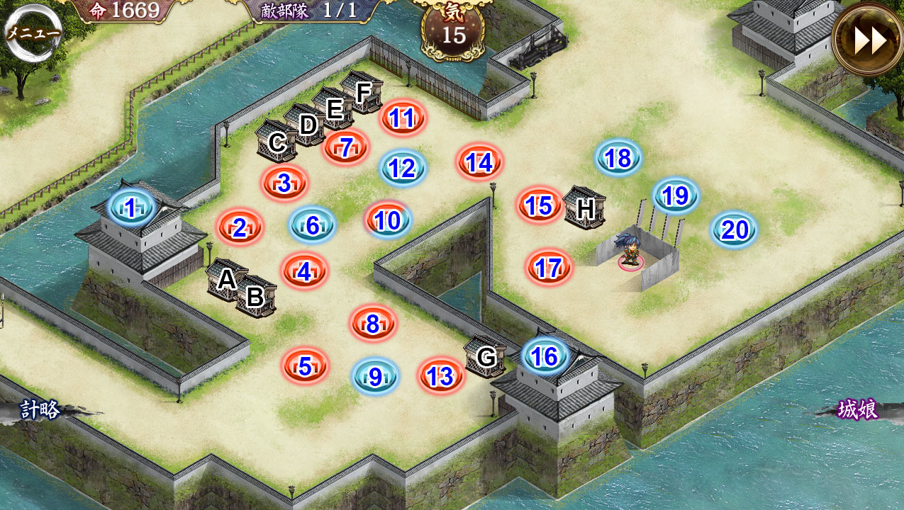 コメントがなかったので、難しいの戦功クリア編成(備忘録程度)。1:銃(耐久面の問題で石弓のほうがいいかも)6:石弓(1と逆のほうがいい)2:槍(1のサポート、高火力)5:槍(最高火力)13:拳 15:槍 18:銃 16:石弓(ここはほとんど意味がない) 3か4:槍 レベルは65前後が五人と40が二人に79の龍ちゃんなのであまり参考にならないかも。 --