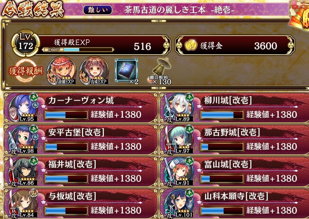 もともと持ってる彦根、紫禁、駿府に加えてマルボル適当にレベル上げたくらいで特別に育成したキャラはいないな。クロンボーとニッカナは改築したから使いたかっただけだからニッカナなくてもいいいしクロンボーも別で代用できると思う。柳生は枠が余ったからおまけ --