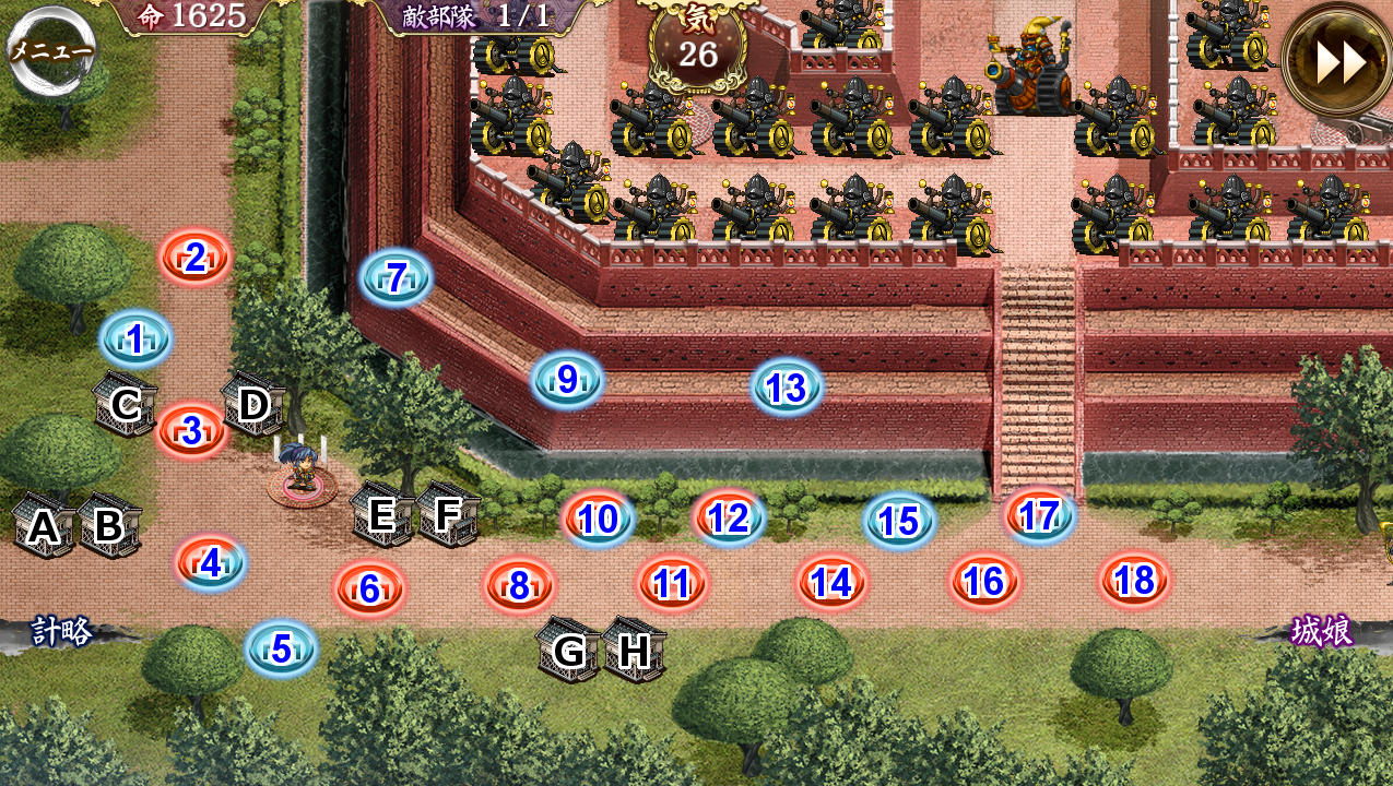 多賀城改壱じゃなくて松本城でも完封できた。最後に出てくる大筒2体は計略使わないと耐久が持ちそうにないけど。 --
