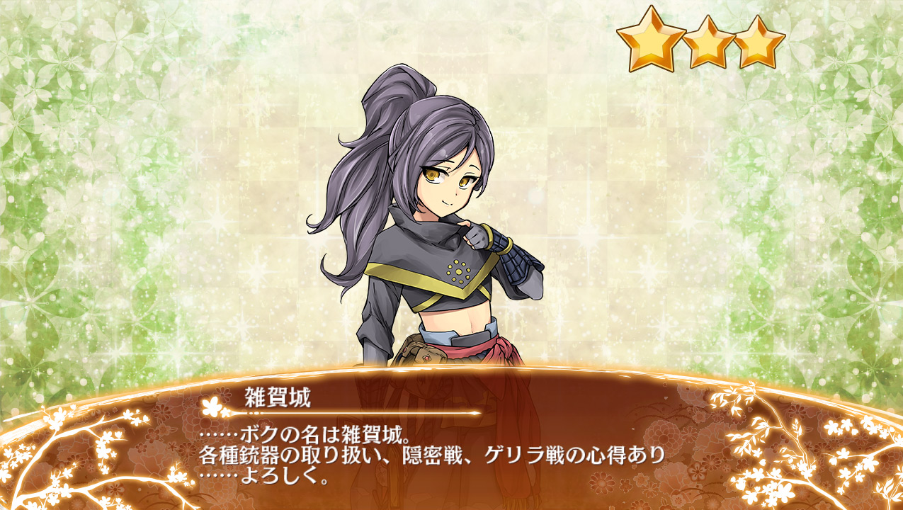 城娘ステータス: 全城娘一覧(刀 | 槍 | 槌 | 盾 | 拳 | 鎌 | 戦棍 | 双剣 | ランス | 弓 | 石弓 | 鉄砲 | 大砲 | 歌舞 | 法術 | 鈴 | 杖 | 祓串 | 本 | 投剣 | 鞭 | 陣貝 | 軍船 | 茶器 | その他 || 平属性 | 平山属性 | 山属性 | 水属性 | 地獄属性 | 無属性)初期ステータス 装備品: 刀 | 槍 | 槌 | 盾 | 拳 | 鎌 | 戦棍 | 双剣 | ランス | 弓 | 石弓 | 鉄砲 | 大砲 | 歌舞 | 法術 | 鈴 | 杖 | 祓串 | 本 | 投剣 | 鞭 | 陣貝 | 軍船 | 茶器 | その他 || 施設 || 消耗品 | 城娘: 特技(攻撃系 / 防御系 / 弱体化他) | 所持特技 | 編成特技 | 大破特技 | 特殊攻撃 | 特殊能力 | 武器切替 | 計略(伏兵以外 / 伏兵) | 都道府県別 | 令制国別 | 季節限定城娘 | 特定カテゴリ |