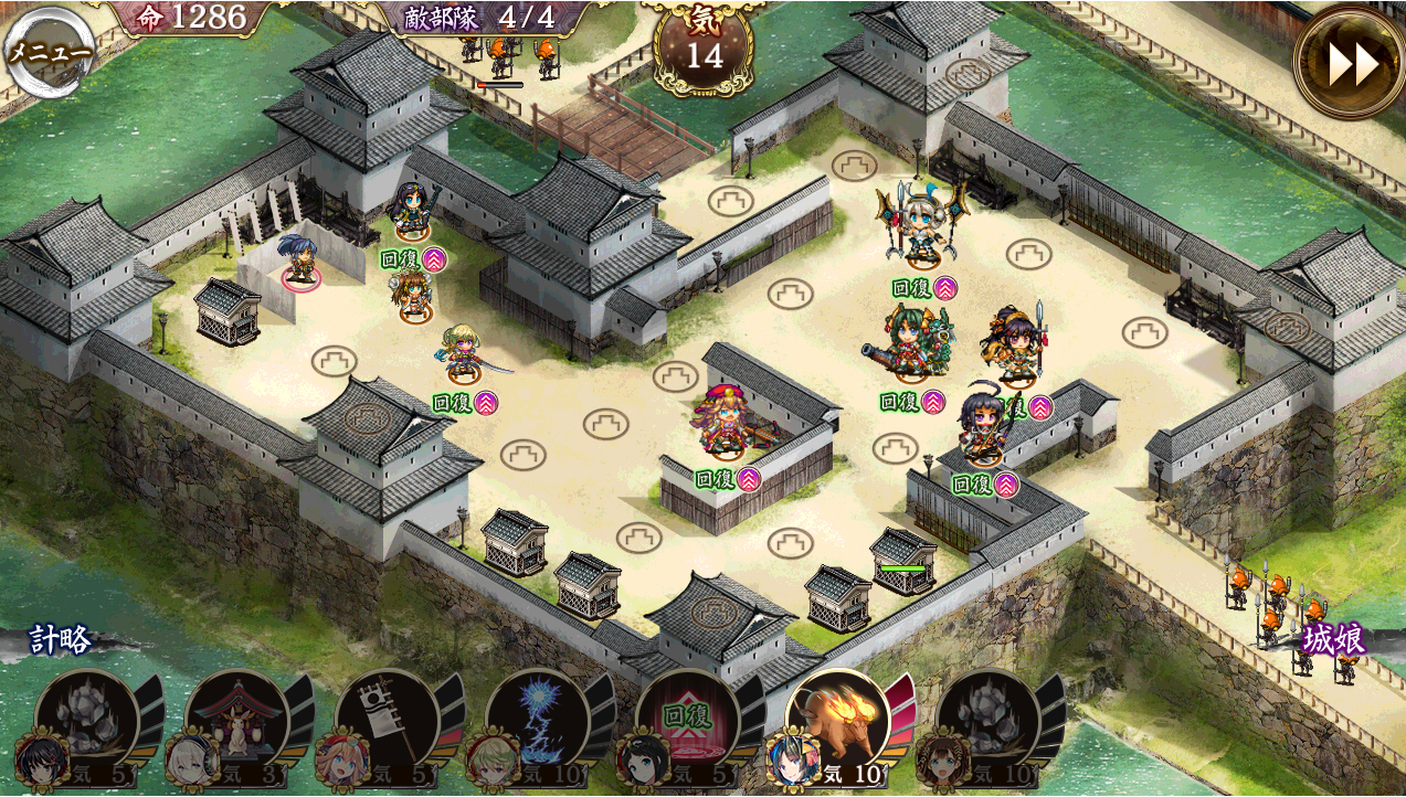 たぶん日付変わってからだと思うんだけど、宇土城の計略の効果がいつまでたっても切れなくて、最終的に全員常に回復上昇状態にできるんだけど、これなんていうヌルゲー?